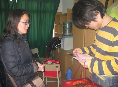 (图为学生工作部部长郁萍老师亲自为春节留校学生送上新春大礼包。)