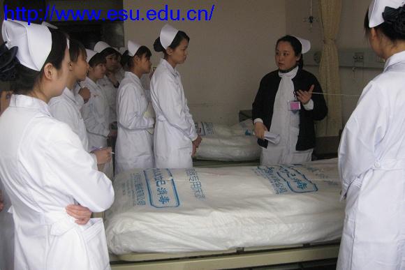 2011年4月8日下午,护理系101班全体40名学生乘校车前往上海市第五人民医院见习。同学们第一次有组织地来到医院环境中,在实际中了解护士职业的工作环境与方式、护患关系与沟通、护士素质与礼仪规范实践等,并在真实的情境中学习知识,理解护士职业的深层意义。大家分为三个小组,分头到第11病区、第6病区和第19病区轮转见习,每个病区见习30分钟左右。从病房到病区走廊,学生们都安静听讲,认真做笔记,提问的时候也控制着自己的音量,真心把自己融入了医院的环境。