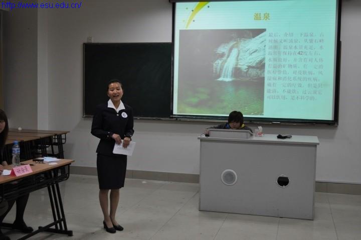 在第一部分旅游景点的介绍中,“山城重庆,三亚海岛,丽江古城,安徽黄山,还有在浴火重生的四川”这一个个美丽的中国景点在参赛选手们的精彩讲述下使人更加向往。同学们模拟导游的工作状态,耐心、生动地为大家讲解着各个景点,让同学们身临其境。第二部分是案例解答,参赛选手们把平时在课堂上学习到的知识很好地运用到了解答题目上,通过这样的比赛,将教学和实践相结合。