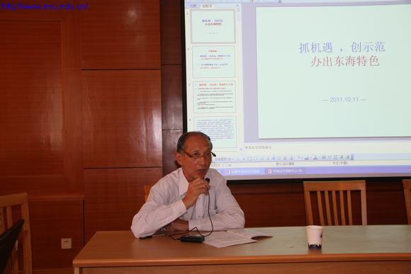 校长项家祥首先在会上作了动员报告,他从学校为何要创建示范性高职院校;我们在创建过程中要做些什么以及成为示范性高职院校会给学校带来哪些影响三方面作了凝练的阐述。他说,我们要通过示范性高职院校的建设,进一步提高办学实力、深化教育教学改革、办出特色,提高社会服务能力,逐步形成结构合理、功能完善、质量优良的高等职业教育体系。同时,学校要以申报示范为抓手,提高学校的内涵建设水平,配合085工程建设计划,齐头并进,建设一批重点专业特色专业,培养一批办学和教学骨干。项校长在报告中指出,申报过程中的关键是要提高学校办学的整体水平,规范管理,推进教学建设和教学改革,加强重点专业领域建设及增强社会服务能力。尽管学校在办学中还存在着困难,但只要全校上下有信心、有决心,齐心合力,东海人的目标一定能够实现。