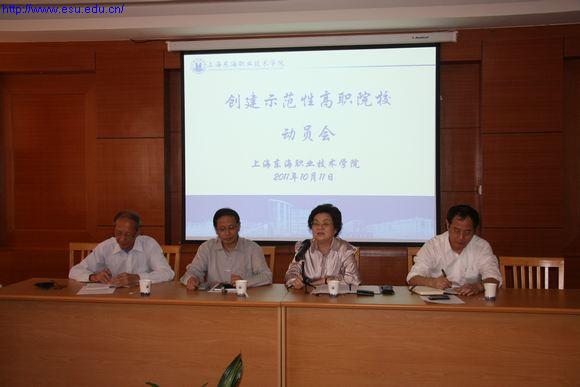 为全面启动示范性高职院校的申报工作,部署申报的具体要求和工作,学校于10月11日召开了创建示范性高职院校动员会。会议由党委书记赵佩琪主持,校长项家祥、副校长程龙根、校长助理教务处处长尹雷方、全体中层干部、各职能部门负责人及院系重点专业主任参加了大会。