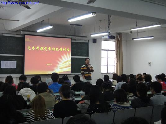 艺术学院党支部于10月24日中午举办了党章学习初级培训班,参加培训的是2011级全体团员。课上,艺术学院院长助理左田田老师为学生讲解了党章的基本内容、入党动机、指导学生怎样写入党申请书,使学生了解党的性质、指导思想、纲领、宗旨等内容,以及如何从思想上真正加入党组织,端正入党动机。培训班结束后,要求每位同学递交一篇学习体会,各班由团支部书记负责组织党章学习小组进一步开展学习党章活动。