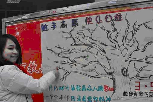 3月5号,校团委学生会在食堂门口举行了“随手志愿、快乐公益”的学雷锋活动。本次活动以宣传画的形式,把社会比喻成一棵大树,老师和同学们按上的手印好比绿叶,“一片片树叶承载着众人的爱心,一个个手印传承着雷锋精神”。不一会儿,那棵原本光秃秃的树上按满了同学和老师们的手印。