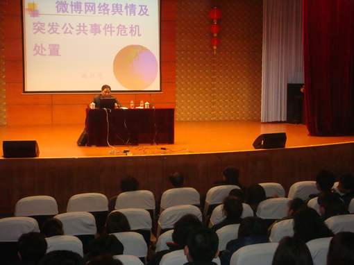 本学期“东海讲坛”开讲, 3月16日我校邀请上海市《文汇报》党委副书记、博士谢海光教授来校作题为《微博网络舆情及突发公共事件危机处置》专题讲座。谢教授讲课语言生动,资料丰富,案例典型,分析透彻,他从微博时代网络作用、网络与大学生创业成才、网络与社会稳定、网络与经济发展及如何处理突发公共事件,特别对如何处理突发事件的原则作了高度概括即:公正、公开、问责、亲民、慎小、沟通。这次讲座为我们提高对网络作用的认识和处理突发事件的水平有很大的帮助和意义。