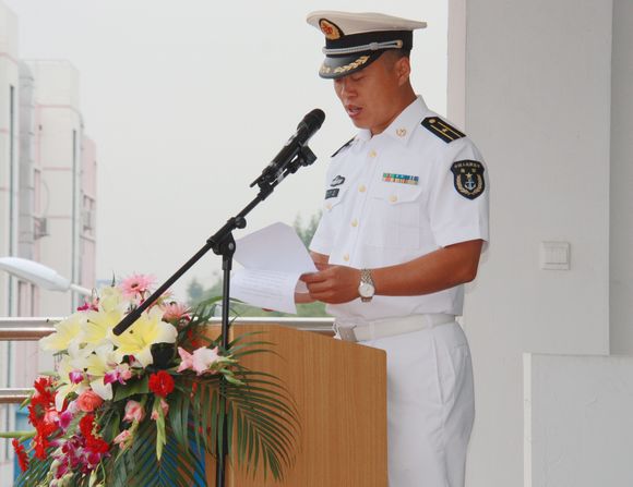东海军训团团长谢夕东少校讲话,希望同学们严格要求自己,严格遵守部队纪律,做好表率作用;军训团会严格要求新生,确保军训质量,进一步提高新生的军事素质,纪律观念。
