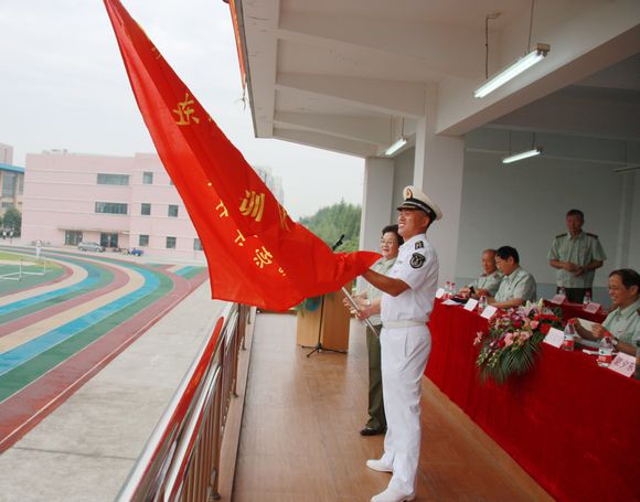 党委书记赵佩琪向军训团团长谢夕授予了军训团团旗