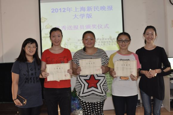 9月27日,校团委在活动中心举行了2012年《上海新民晚报(大学版)》优秀送报员颁奖仪式。杨静老师和胡忱老师为我校勤工俭学的优秀送报员颁发了证书。我校勤工俭学的同学,在过去的一年中,风雨无阻的将《上海新民晚报(大学版)》送进每一个寝室,坚持不懈的为我校学生提供着了解外界和社会的渠道,丰富了同学们的业余生活,便捷了信息的传递,他们尽职尽责,踏实认真,努力工作并潜移默化的拓展着同学们课外阅读的视野。杨静老师给辛勤劳动的同学们以极高的赞扬,并希望同学们继承发扬他们的精神。