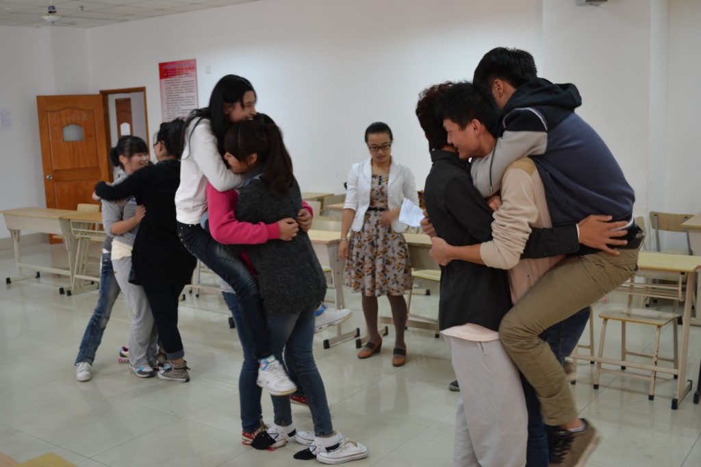 拼图项目是一项趣味横生的淘汰赛。以两名同学为一组,未在规定时间内完成拼图的即被淘汰出局。踩报纸比赛,主要考验的是团队的智慧和协作能力。每组三名同学,一起站在统一大小的报纸上。随着主持人的指令,不断对折报纸,第三个队员需保持同时站在报纸上并维持5秒钟不倒。经过几轮的淘汰晋级,最后其中一组女生以43秒暂时领先。