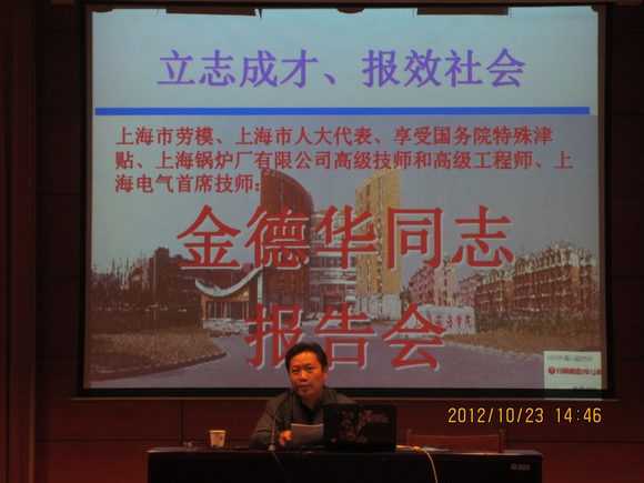 10月23日,继续教育学院请来了上海市劳模、上海市优秀共产党员、上海市人大代表、上海锅炉厂有限公司金德华同志为成教学生作《立志成才、报效社会》的励志教育报告。他先后获得2006年全国杰出技术能手、2007年全国机械工业技能大师和市劳模等称号,享受国务院特殊津贴。金德华工作室荣获第二届上海市职工科技创新优秀团队、2008年度上海市“工人先锋号”称号。整个报告厅里座无虚席、鸦雀无声,全院师生怀着崇敬的心情聆听了金德华老师成长的经历和成功的经验体会。