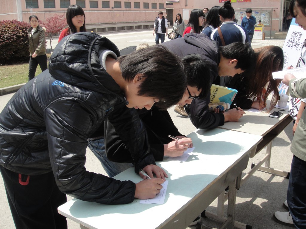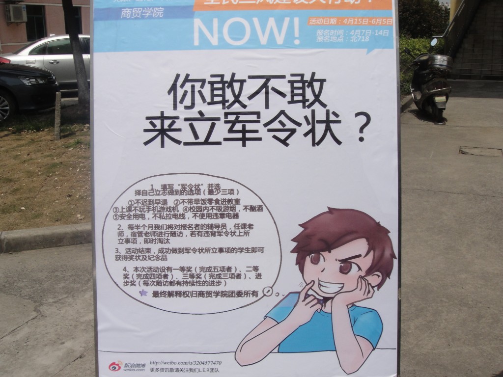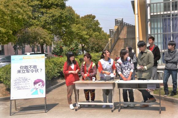 4月10日,为响应学校三风建设工作号召,树立优良学风。商贸学院分团委在体育馆门前举行“我敢来立军令状”学生学风建设活动。上午11时许,活动如火如荼展开,同学们自愿签署“军令状”,承诺上课不迟到、不早退,上课不玩手机游戏等,自觉规范自身行为,提升自身素质。活动还设立了四个等级的奖项来奖励成功完成“军令状”的同学。新颖的活动吸引了大量同学围观、参与,举办者们热情地一一向他们介绍举行本次活动的目的、意义。很快,60张“军令状”被签署完毕。