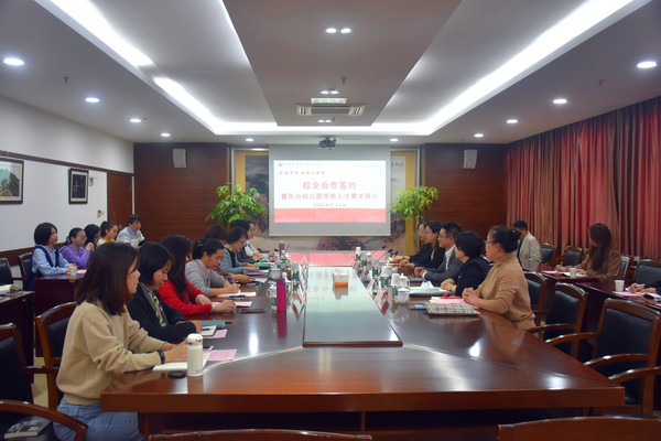 双方就民办幼儿园学前人才需求开展了深入研讨交流。学前教育专业主任王杰汇报了专业建设目标、人才培养举措、专业创新特色和一年来的建设成果等。徐汇区杜鹃园幼稚园园长薛乐、徐汇区民办滨江幼儿园园长徐臻妮分别介绍了各自幼儿园的基本情况以及办园特色,强调了“润泽心灵、强健体质、启迪智慧、助推成长”的教育理念。新徐汇教育人事主管徐敏重点介绍了公司统一的课程开发系统与统一的教师选拔与培训系统,强调:在当前幼儿教师的大量需求的时代背景下,公司高度重视幼师人才的引进与培养,除了要符合学历、专业、幼儿教师资格证等基本条件之外,公司还特别注重幼师的心理健康测试与与综合素养考查。双方还就幼师职业技能培养、教育教学能力提升与职业生涯规划发展等问题展开了热烈讨论。
