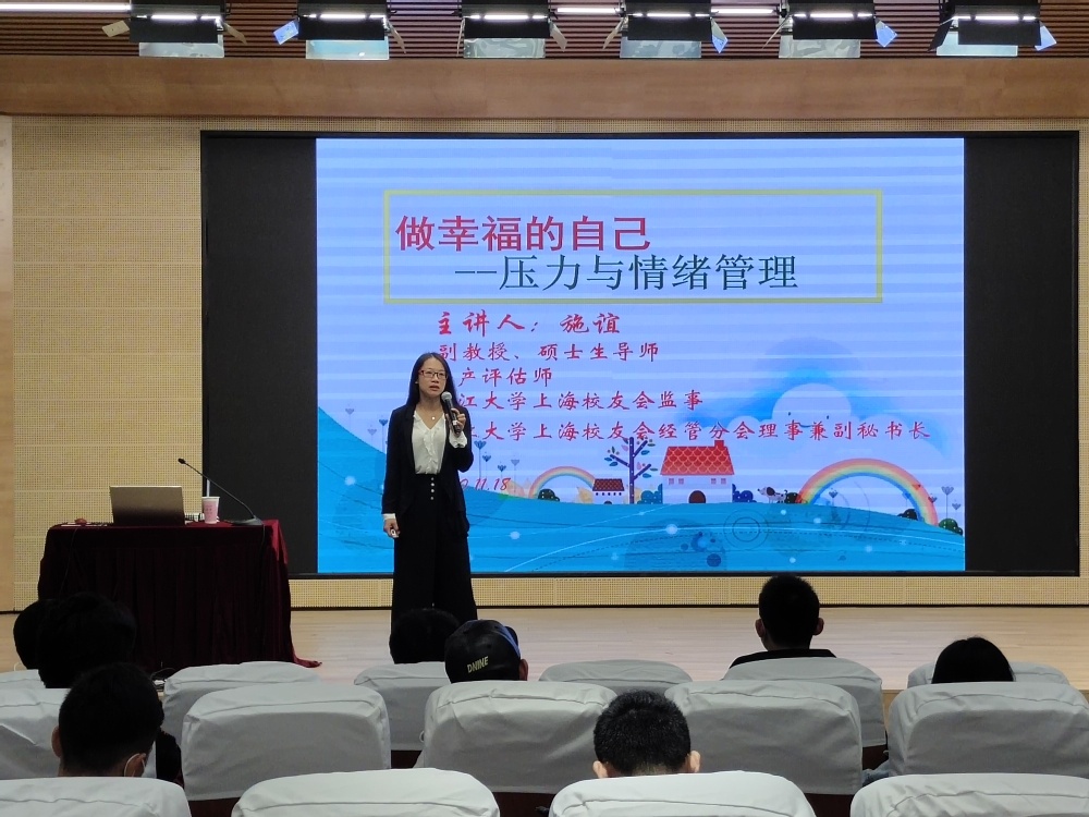 11月18日,上海应用技术大学副教授、硕士生导师施谊应邀为经管学院大一新生作《做幸福的自己—压力与情绪管理》的主题讲座。经管学院145名大一新生在匠兴苑报告厅聆听了讲座,讲座由学工办主任许小梅主持。