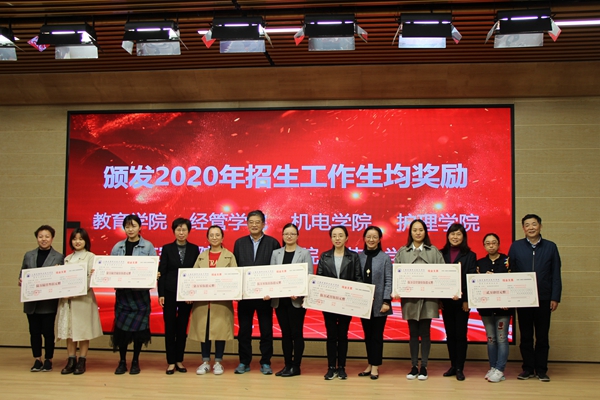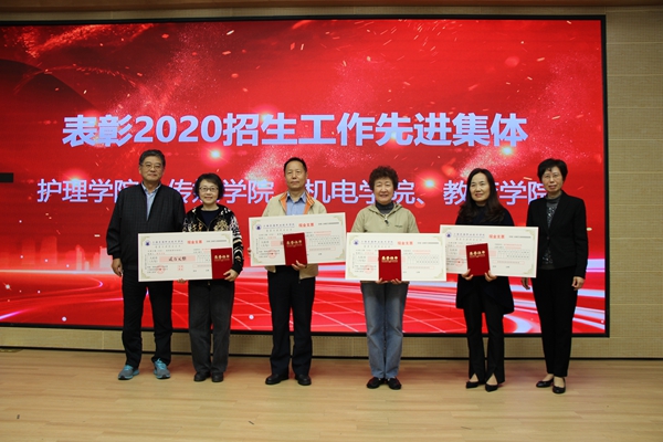 会议还表彰了一批在今年招生工作中表现突出的先进集体,党委书记曹蓉蓉宣读《关于表彰2020年招生工作先进集体的决定》。校长王刚、党委书记曹蓉蓉为获得“先进集体”荣誉称号的传媒学院、护理学院、教育学院和机电学院颁奖;接着,校领导们为全校7个二级学院颁发招生工作奖励。