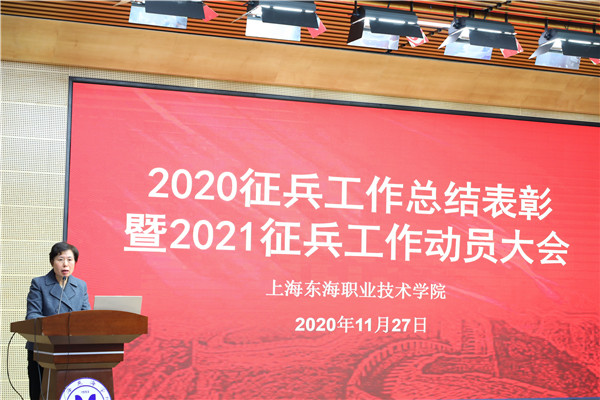 党委书记曹蓉蓉对获得征兵工作先进集体、先进个人荣誉称号的学院和辅导员表示祝贺。对参与征兵工作的各级干部和辅导员致以崇高敬意。她表示,东海学院作为民办高校能够连续9年荣获上海市征兵工作先进集体称号是难能可贵的。希望大家继续做好2021年的征兵工作,严格落实国家及上海市征兵工作要求,扎实推进我校征兵工作,并且为此提出了三点要求:一要深刻认识征兵工作的重大意义,提高政治责任感。征兵是一项严肃的政治任务,各级干部和辅导员必须把思想统一到习近平总书记和党中央的决策部署上来,以高度的政治责任感和使命感做好征兵工作。二要把征兵工作作为学校国防教育、爱国主义教育的一项重要内容。立德树人是高校的根本任务,大学生参军也是我校人才培养、拓展延申的一种方式,也是对学生爱国主义教育成效的检验。我们要广泛宣传、动员,鼓励更多的优秀大学生参军入伍,引导学生投身军营,把爱国之心化为报国之行。三要明确目标任务,细化责任分工,通力协作。学校武装部要履行好征兵主体责任,与各学院、各相关职能部门紧密配合,做到参军政策宣传到位、人员落实到位、服务保障到位,让每位学生“入伍安心、服役暖心、退伍放心”,确保学校2021年征兵工作高标准、高质量完成。