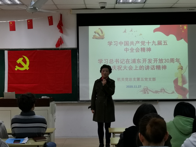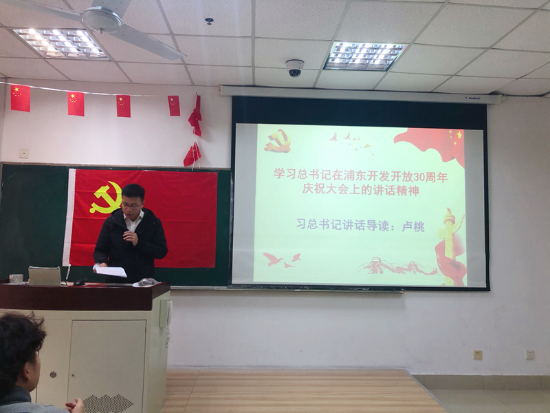 学习会分为两个议程,一是学习精神,二是支部书记讲党课。在第一个议程中,与会党员与学生干部共同学习了中国共产党十九届五中全会精神和习近平总书记在浦东开发开放30周年庆祝大会上的重要讲话精神。由支部委员薛娇和支部委员卢桃分别就讲话精神进行导读。