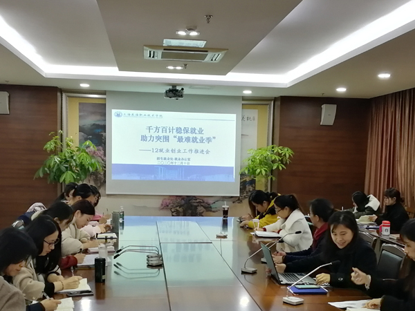 12月10日下午,我校2020年12月就业创业工作推进会顺利举行。本次会议组织学习了2021届全国普通高校毕业生就业创业工作网络视频会等会议精神,通报了我校2021届毕业生就业工作进展,分析了2021届毕业生求职就业形势,并对下阶段2021届毕业生就业工作任务作了细致部署。会议由副校长郁萍主持,各学院学工办主任、2021届毕业班辅导员及就业办全体成员出席。
