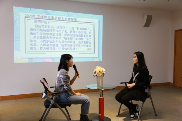12月10日,我校2020年度辅导员素质能力大赛复赛举办。大赛由党委副书记王玉、学工部部长杨瑾、社科部副主任龙燕、学工部副部长王莉娜担任评委,各二级学院学工办公室主任及全体辅导员观摩比赛。