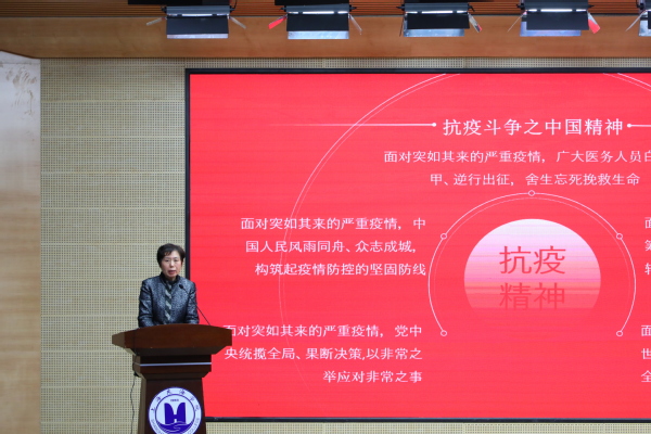最后,党委书记曹蓉蓉以《弘扬伟大抗疫精神,推动东海教育事业再上新台阶》为题发表讲话,总结回顾了学校2020年疫情防控工作。她说,抗击新冠肺炎疫情斗争取得重大战略成果,给了我们四点启示:一是以习近平同志为核心的党中央坚强领导,是我们经受考验战胜疫情的根本保证;二是坚持社会主义制度优势,是我们共克时艰战“疫”攻坚的坚强保障;三是在斗争中凝结升华的抗疫精神,是我们不畏艰险战“疫”到底的强大动力;四是青年在抗疫斗争中不惧牺牲,用臂膀扛起如山的责任,是可堪大任的一代。她强调,在抗击疫情的关键时期,坚守抗疫一线的东海教职员工用无怨无悔的付出和无私奉献的坚守换来了师生平安,换来了东海无恙,充分展现了责任意识、大爱意识和全局意识,极大丰富了东海精神的时代内涵,为东海人树立了榜样,是东海“最可爱的人”。她鼓励全体师生员工弘扬伟大抗疫精神,勇敢地扛起使命担当,立足岗位,不负时代,实现人生价值,培养优秀人才,创造新的辉煌,努力推动东海教育事业发展更上新台阶,为全面建设社会主义现代化国家、实现中华民族伟大复兴贡献力量!