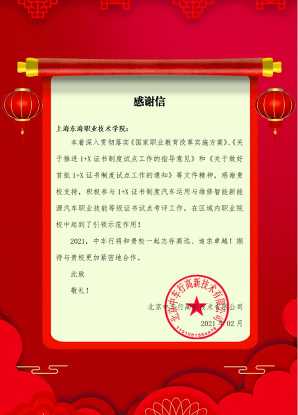 2月5日,机电学院收到了来自北京中车行高新技术有限公司发来的感谢信。信中对机电学院“1+X证书制度”智能新能源汽车职业技能等级证书试点考评工作给予高度赞扬,并期待在新的一年里与我院展开更加紧密的合作。