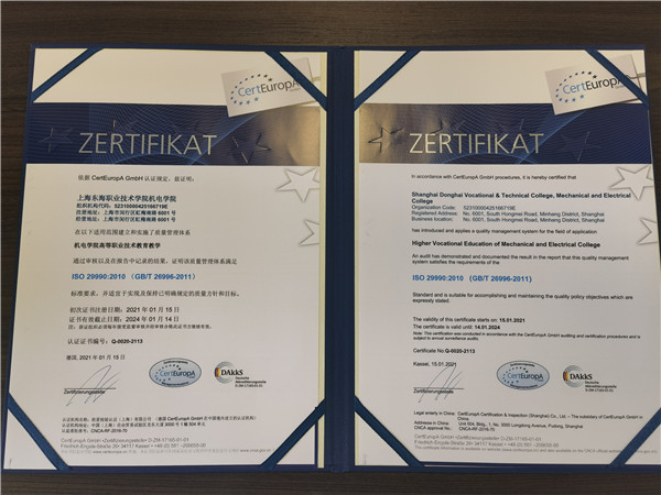 近日,我校机电学院收到来自德国DAKKS(德国认可委员会)批准的认证机构欧星检测认证有限公司颁发的ISO29990高等职业技术教育教学认证证书,是我院教育教学对接国际职业标准,推进国际化办学,培养国际化技术技能人才培养方面的又一重大举措。
