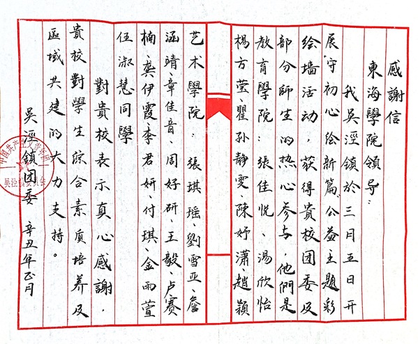 日前,吴泾镇团委给我校发来感谢信,感谢我校团委及师生在3月5日吴泾镇开展的“守初心,绘新篇”工艺主题彩绘墙活动中的做出的积极努力。教育学院张佳悦、汤欣怡、杨方莹、瞿孙静雯、陈妤潇、赵颖;艺术学院张琪瑶、刘雪亚、詹涵靖、章佳音、周好研、王毅、卢赛楠、龚伊霞、李君妍、付琪、金雨萱、伍淑慧18名学生热心参与此次活动,展现了良好的综合素养,为推进区域共建积极奉献自己的力量。(通讯员 刘会娟)