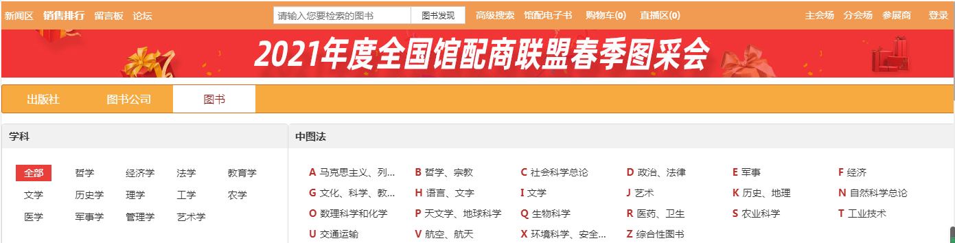 (2)图书分会场:根据图书的中图法分类及学科分类展示各类图书,直接点击分类即可进入选书界面