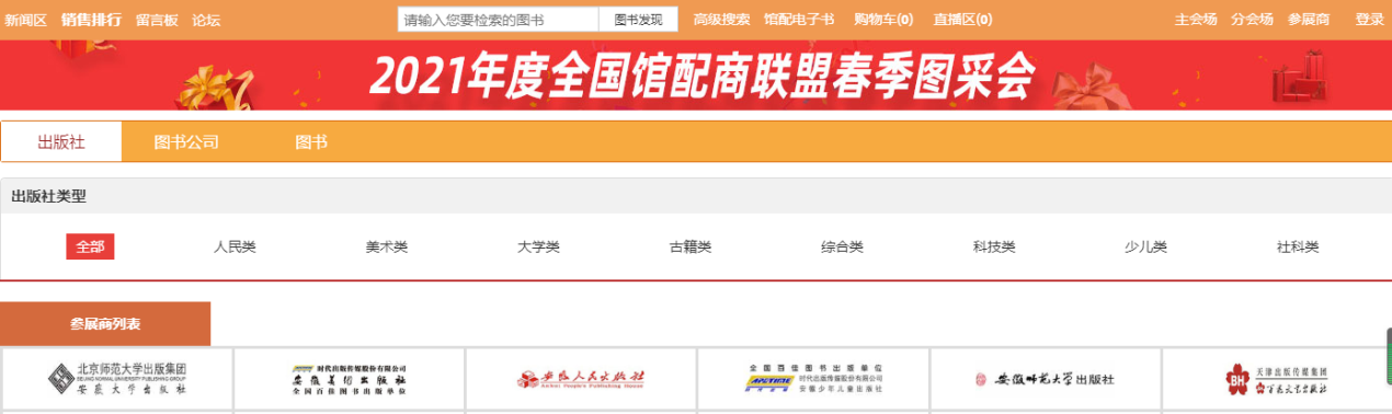 (1)出版社分会场:按出版社综合分类和出版公司名称展示各出版社图书,点击分类首先展示该类别下的出版社名单,点击出版社名称即可进入选书界面。
