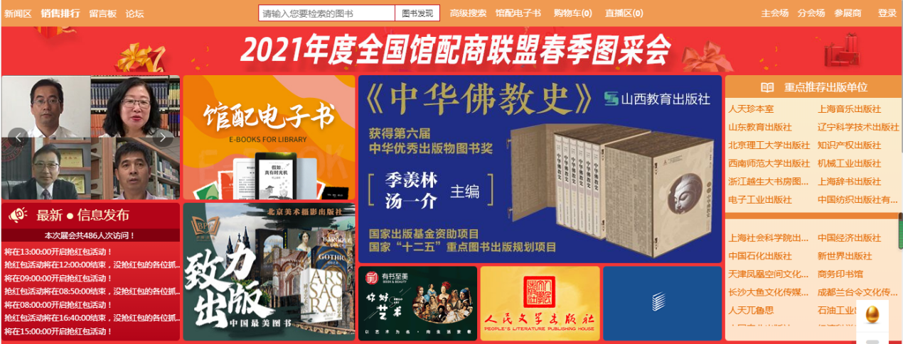 3、论坛:2021全国馆配商联盟春季线上图采会期间平台以录播方式播出以《图书馆智能化建设的发展趋势》、《哥伦布克——基于图书的知识发现》、《优化出版品种结构对图书市场的影响》为主题的三场论坛。