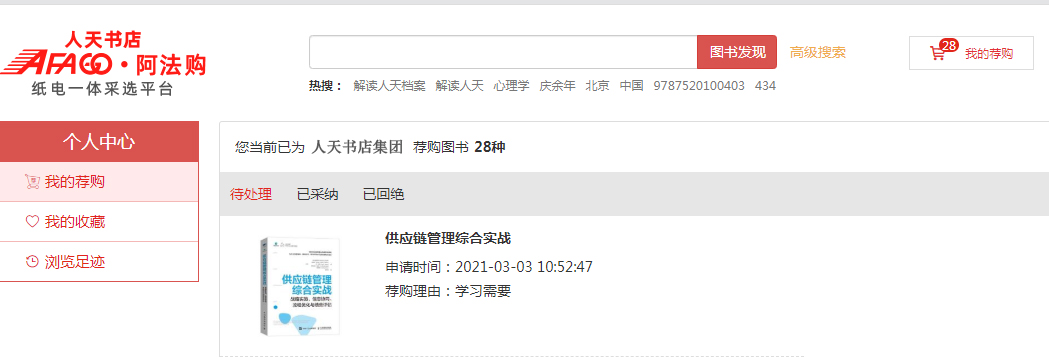 3、我的荐购:【个人中心】→【我的荐购】 中可查看到所有的荐购书目,及图书馆的采纳情况。