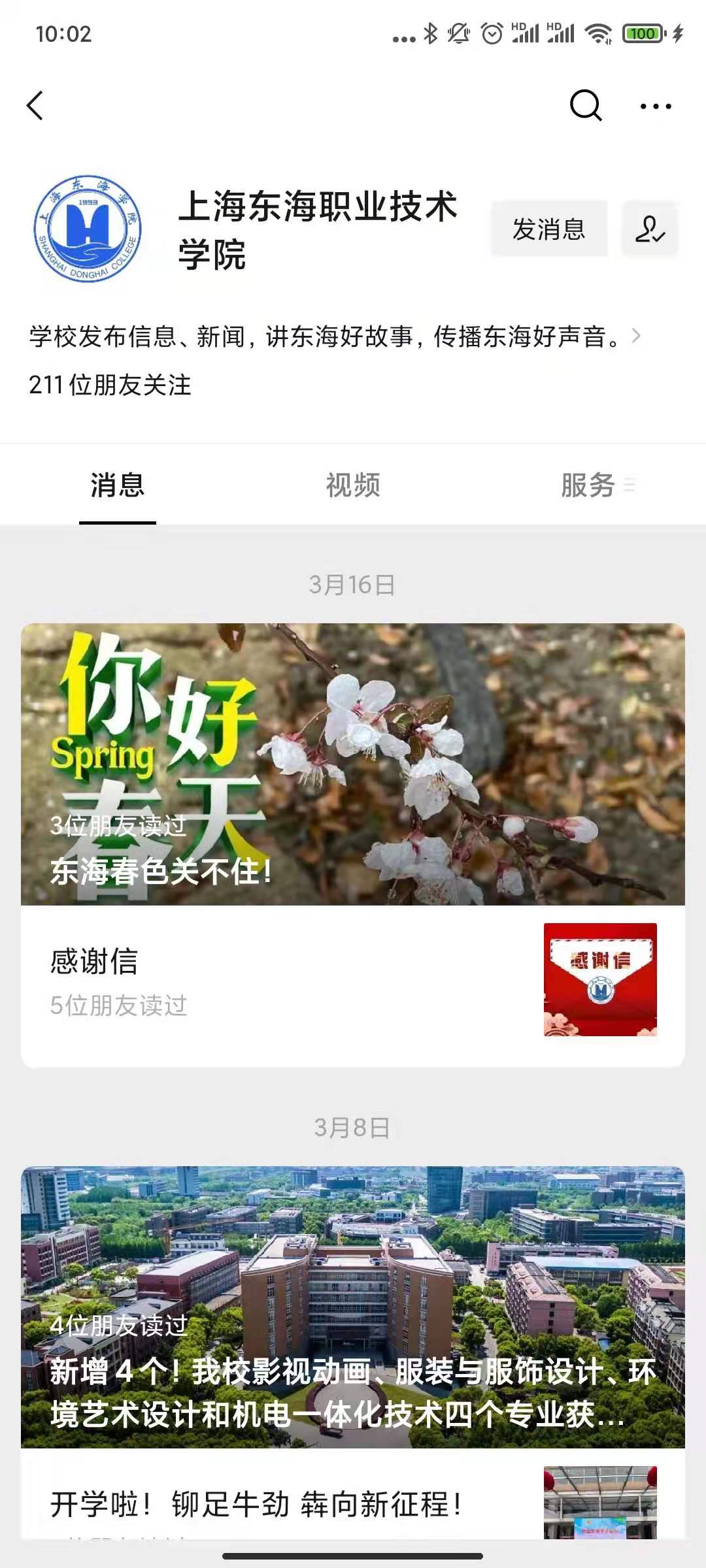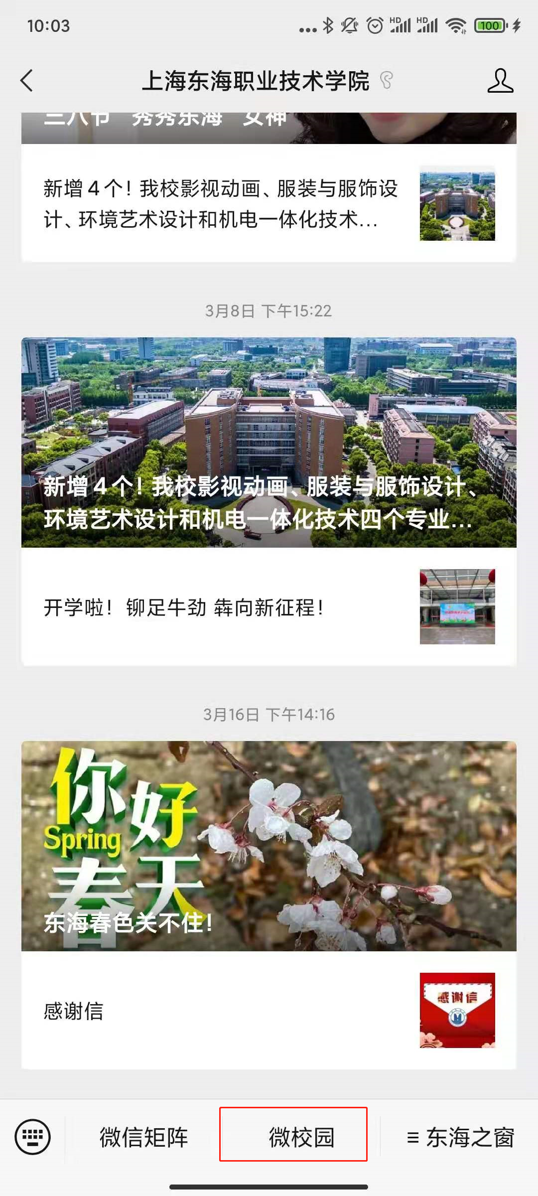 第一步:从微信中搜索 “上海东海职业技术学院”微信公众号,点击关注后,点击下方“微校园”链接。
