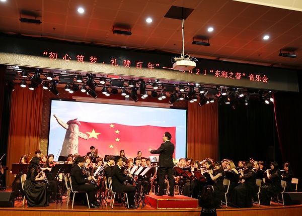 为深入贯彻党的十九大精神,全面落实习近平总书记在全国教育大会上重要讲话,弘扬美育精神,将美育教育融入日常活动和思政教育中,提高我校学生的艺术修养、人文素养,坚定文化自信,促进各民族交往交流交融,筑牢中华民族共同体意识。4月15日,学工部举办“初心筑梦,礼赞百年”—2021年“东海之春”专场音乐会,特邀上海师范大学天华学院交响管乐团来校演出,为400余名学生奉上了一场视听盛宴。