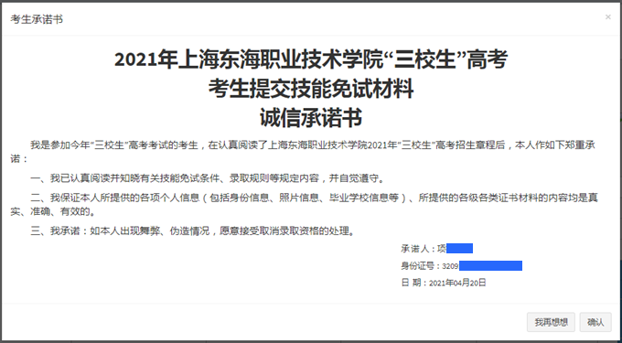 (五)完成上述操作后,请考生认真阅读“考生提交技能免试材料诚信承诺书”,并点击“确认”按钮完成申请流程;