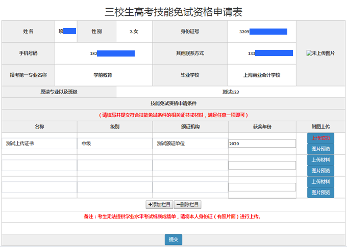 (六)考生完成申请流程后,请耐心等待,两天后再次登录系统查看申请结果。经审核合格的考生可免考职业技能测试科目,审核不合格的考生,须参加5月16日在我校举行的各科目考试。上海市语文、数学、外语统一文化考试所有考生必须参加。