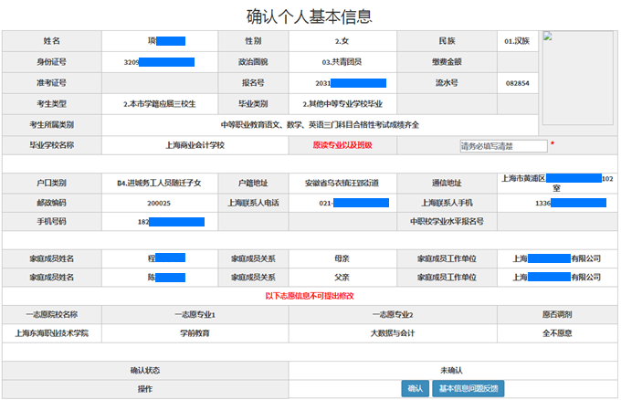(三)登录成功后,点击页面左侧“确认基本信息”进入信息确认页面,请核对本人基本信息是否正确,若确认无误请在操作栏点击“确认”按钮;如需修改,请点击“基本信息问题反馈”按钮,在备注栏输入需修改内容及原因(注:每位考生仅可提交一次信息修改申请),其中志愿信息不可修改,提交后耐心等待我校审核,修改无误后考生须再次点击“确认”,否则无法进行后续操作;
