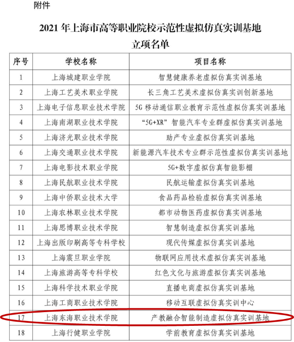 6月9日,上海市教育委员会公布了2021年上海市高等职业院校示范性虚拟仿真实训基地立项名单,我校机电学院“产教融合智能制造虚拟仿真实训基地”建设项目成功获批立项。