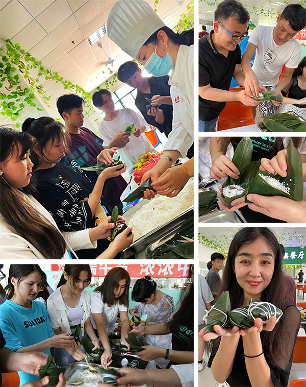 此次活动主要让学生们体验端午节传统食物粽子的制作过程。学工部邀请食堂阿姨给学生们具体讲解从折粽叶到放馅到扎绳的步骤和技巧。手把手教学生们实操体验。从没有包过粽子的00后的新疆学生,对这次新鲜的体验表现出浓厚的兴趣。跟着食堂阿姨们一遍遍卷粽叶,一次次尝试放馅的多少,一回回拆开漏米的粽子小心翼翼地再包好。经过不断地尝试与学习,一个个棱角分明的粽子在大家手中逐渐成型,大家迫不及待的分享劳动成果,细诉自己动手的满足与感受。活动现场欢声笑语不断。