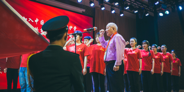 朗诵《追寻》展现“血脉传承”篇章的主题,展现出青年一代胸怀祖国、追求梦想、开创未来的执着与担当。50名新党员在领誓人陶钧同志带领下,面对党旗进行庄严的宣誓仪式。大合唱《唱支山歌给党听新编》唱出了全体东海党员的心声——立足岗位,为党育人,为国育才,再建新功。