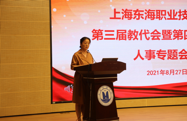 8月27日上午,上海东海职业技术学院第三届教代会暨第四届工代会人事专题会议在匠兴苑学术报告厅召开,教工代表80余人参加,副校长郁萍主持会议。