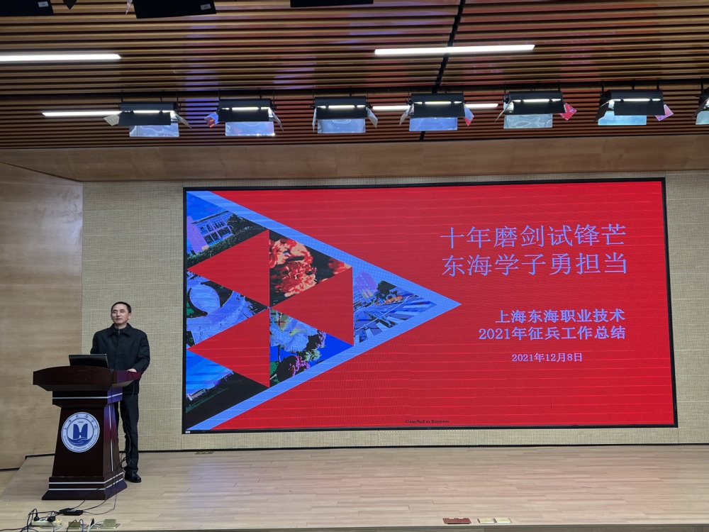 武装部长蒋久泉首先作2021年征兵工作总结,并对2022年征兵工作要求及注意事项做了说明。他说,东海学院已连续10年被上海市评为征兵工作先进单位。2021年,在学校党委和征兵工作领导小组的领导下, 43名学生被闵行区征兵办批准入伍,其中,应届毕业生为25人,占入伍总人数的58.13%,超过上海市征兵办要求的40%比例。
