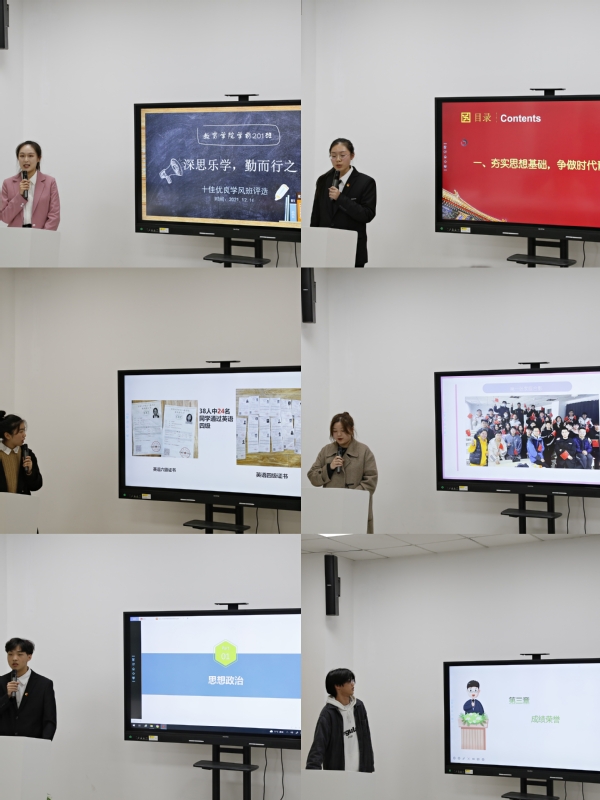 为深入贯彻习近平新时代中国特色社会主义思想和党的十九大及十九届六中全会精神,坚持立德树人的根本任务,培育和践行社会主义核心价值观,展现当代大学生奋发向上的精神风貌,树立先进班级学习典型,展示各班在学风建设中取得的成就,总结班级学习成果,提供互相学习平台,学生工作部于12月17日开展“十佳优良学风班”答辩。经学院评选推荐、学校复核,共有14个班级进入答辩环节。