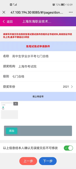 (四)完成上述操作的考生请点击申请,在页面“免笔试面试申请条件”栏填写相应证书名称、颁证机构、级别、年份等信息,并上传证书图片,填写完毕后点击提交。