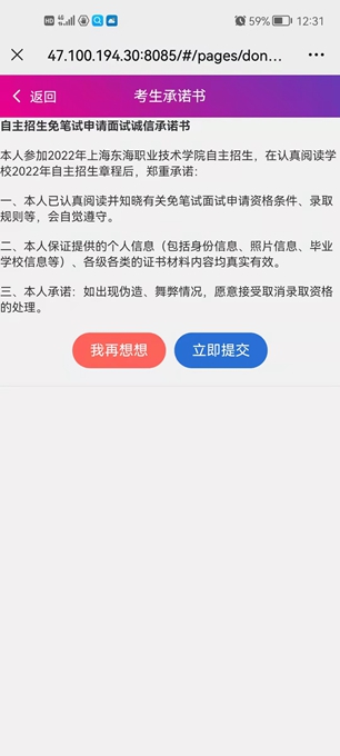 (五)完成上述操作后,请考生认真阅读“自主招生免笔试申请面试诚信承诺书”,并点击“立即提交”按钮完成申请流程,并耐心等待审核结果。