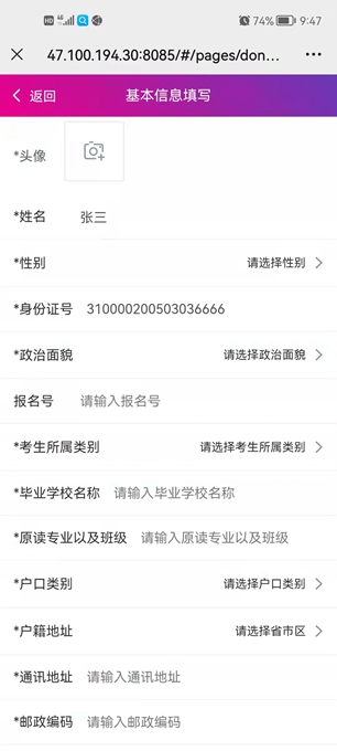 (三)登录后,点击页面 “自主招生申请免笔试”进入信息填写页面,请填写本人基本信息,填写后确认无误,请点击确认按钮继续操作。