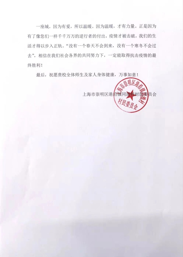 3月21日,学校收到了崇明区港沿镇同滧村村民委员会发来的感谢信,感谢我校师生为同滧村第二轮核酸检测快速高效完成提供支持与助力。