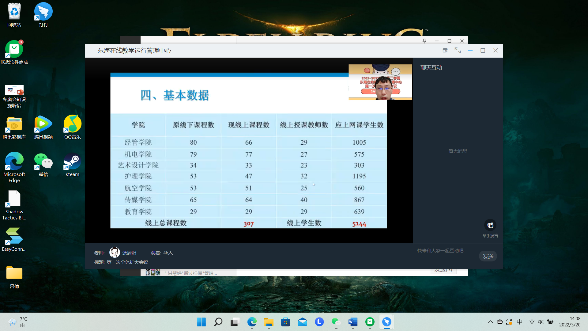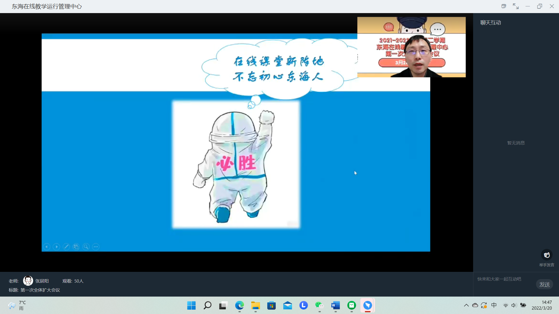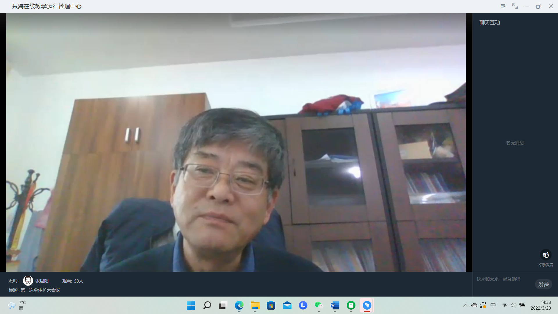 面对突如其来的本轮新冠疫情和准封闭管理,东海学院教育教学工作再次全面转入线上模式。3月20日,学校“在线教学运行管理中心”召开了第一次全体扩大会议,校长王刚、党委副书记王玉、副校长卓丽环,各教学部门负责人,专业主任,直播巡视员、相关教学、学生管理人员近60人参会,会议由教务处长张居阳主持。