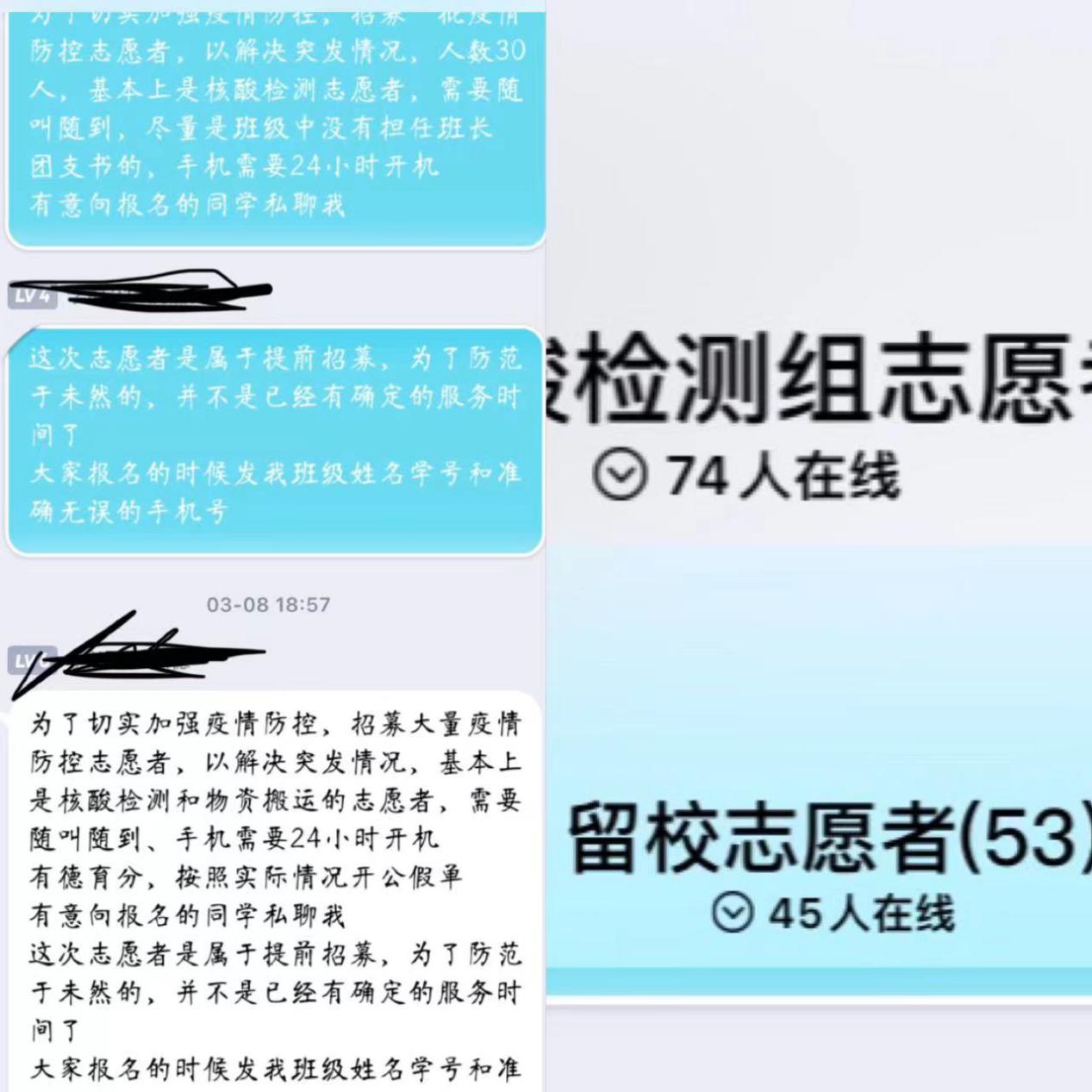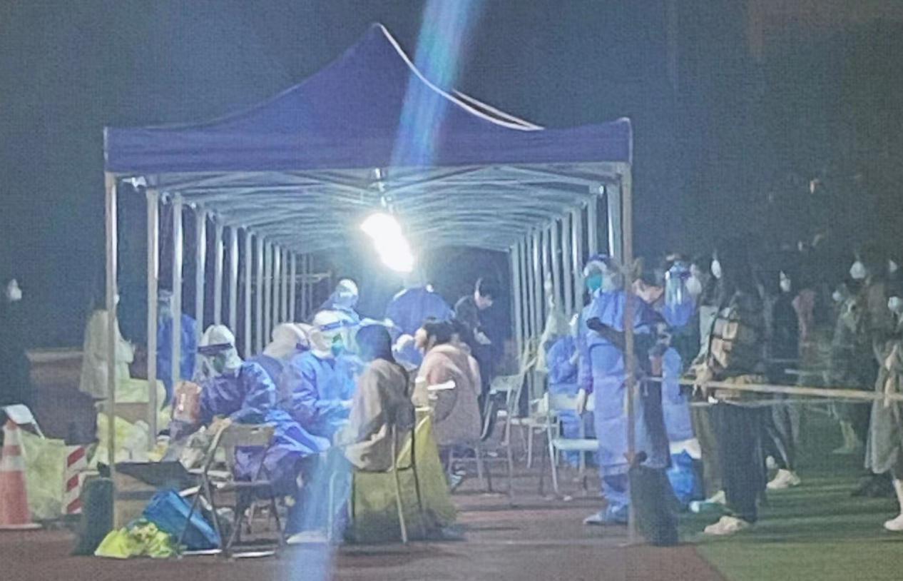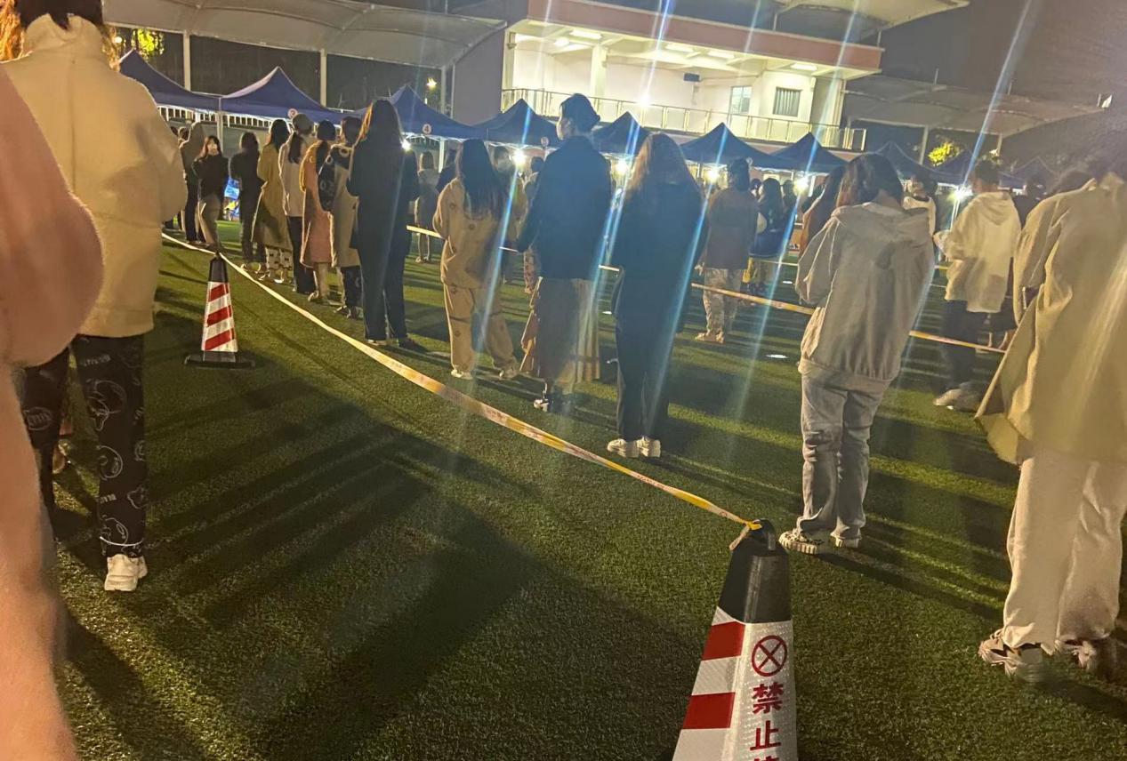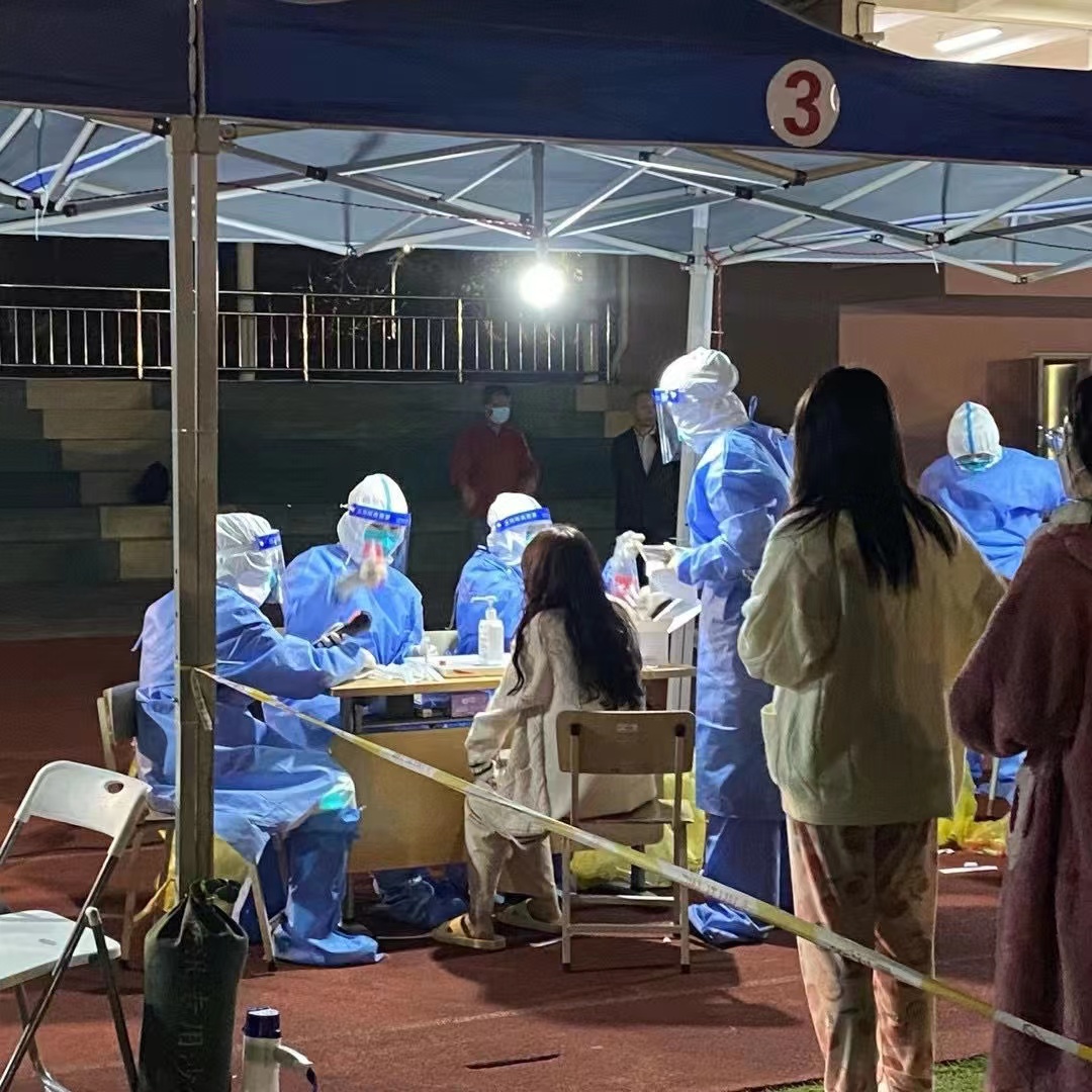 3月11日20:00,学校组织师生在操场进行大规模的核酸检测,各岗位志愿者自觉到场,秩序较好,一直到3月12日凌晨结束采样。