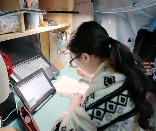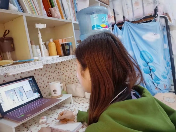 为了让我们更好的适应网课,老师选择了“减法立裁”。减法立裁和我之前接受的知识是完全不一样的,在此之前我接受的是要严谨准确,而线上的网课更要求我们在掌握一定方法的前提下有创意。我们虽说上网课多有不便,但老师依旧负责,整个课堂充满趣味又不失学习的严谨,我们有任何疑问都可以得到及时地解决。 ——服装202班 马小艳