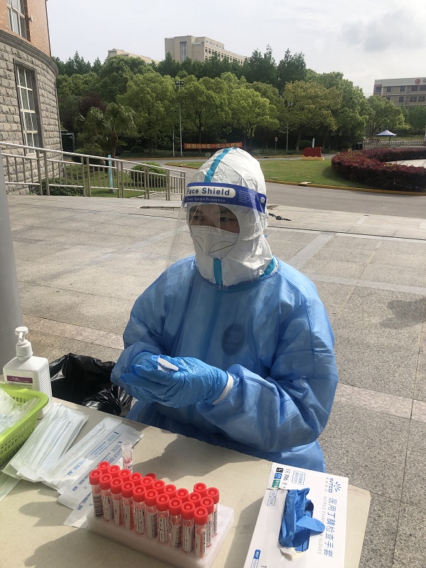七天隔离期满后,张桐桐立刻加入核酸采样突击队,早上六点多,就和突击队的其他成员一起穿上防护服,清点核酸采样物品,展开紧张忙碌的核酸采样工作。为了减少人员流动,坚持“大白动,人不动”的采样原则,在体育馆、东海源、匠兴苑各采样点间移动。