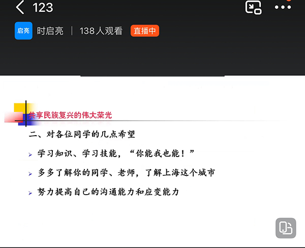 讲座结束后,学生们纷纷与时老师连线,通过一个个小故事分享了在校期间学习生活的场景,表示虽然疫情仍在继续,但没有阻止自己前进的心;作为当代大学生,在实现中华民族伟大复兴的过程中,一定会切实发扬“工匠精神”,认真学好自己的专业知识,敬业、精益、专注、创新,将个人理想融入祖国伟大复兴的过程当中,以实际行动践行青春的誓言。