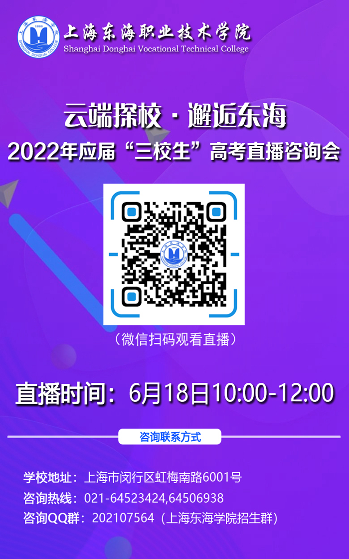 为方便广大考生和家长了解招生信息,2022年“三校生”高考招生咨询系列活动即将举办,根据本市疫情防控要求,本次活动通过线上直播和“东方网”网上咨询两种方式开展。上海东海职业技术学院热忱欢迎大家积极参与,具体安排如下: